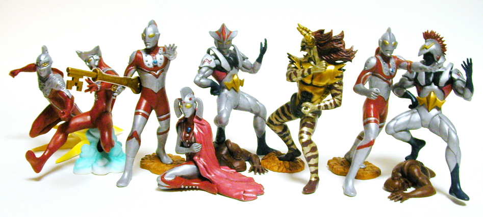 また、オリジナルのキャラである魔王ジャッカル(右から3番目)や、ウルトラマンメロス(右から4番目)、そしてメロスの鎧着用バージョン(右端)なども立体化されています。当時は鎧を着るウルトラマンという設定が強いインパクトでした。
