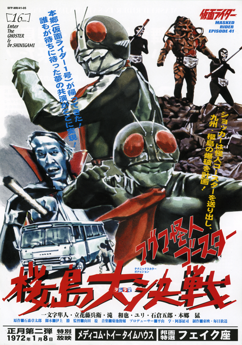 その後、一文字を助けるためにスイスから本郷が帰ってくるというエピソードが作られ、それが、桜島をはじめ九州ロケが行われたのが40話と41話の「マグマ怪人ゴースター桜島大決戦」です。その時に新しく1号のマスクとスーツが作られるわけですが、もともとあった1号のマスクは、2号へとすべてリペイントされていたからです。以前の1号マスクと違ってスマートな印象で、さらに傷ついたマスクを補修するスプレーが「黒」しか無かったため、色が濃くなり、以前の旧ライダー1号と区別するため、後にライダーファンが「桜島1号」と呼ぶようになりました。1号は、53話からカラーリングも一新し、新1号となり、カムバックしますが、桜島バージョンは、旧1号と新1号の橋渡しとなる貴重な存在となります。ちなみに、新1号と2号を区別するためにラインの数を変えていますが、後にさらに2号は赤い手袋とブーツをまとい、現在の形へと変わり、両者とも伝説のライダーとなるのです。